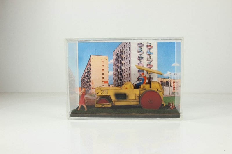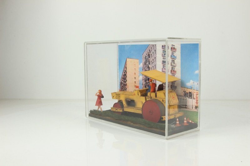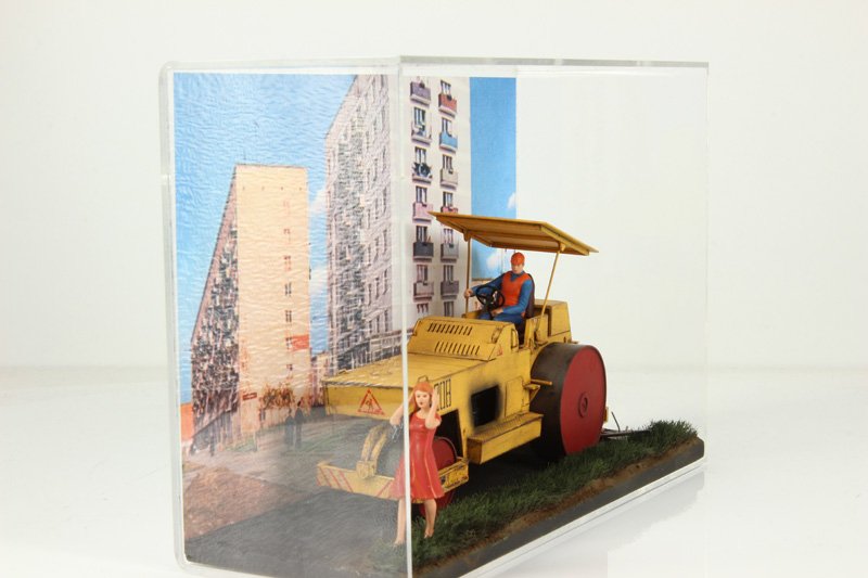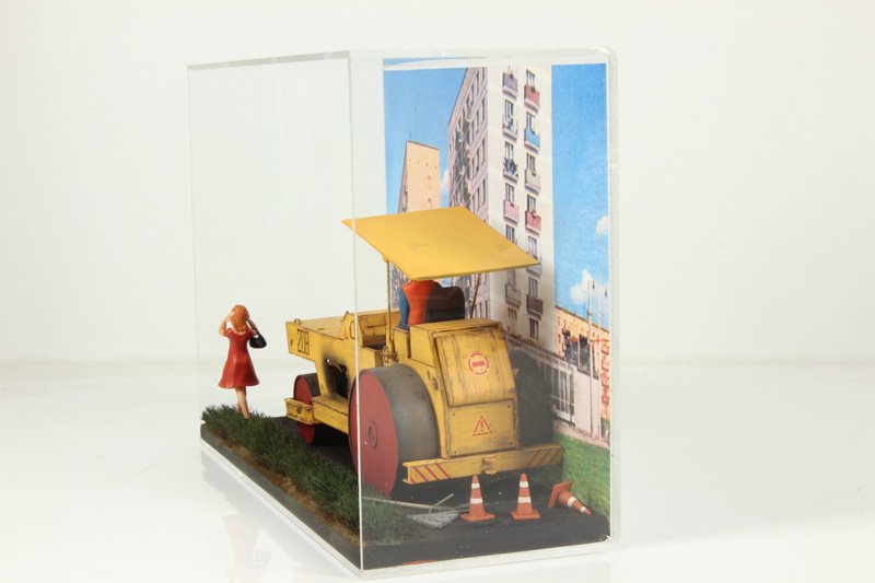 В связи с появлением нового изделия (настенный бокс) была задача что-то исполнить в этом боксе, какие-то композиции. Мастера не были ограничены выбором сюжета, поэтому сделали такое. Каток едет, мимо проходит девушка, закрыв уши руками.